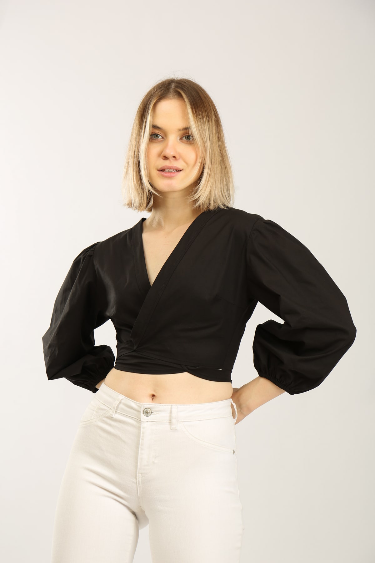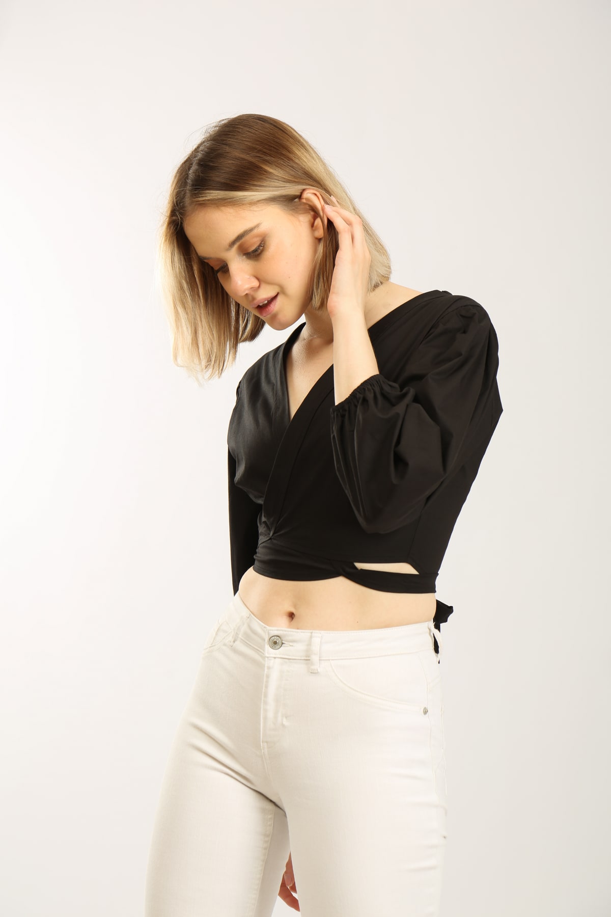 Kruvazeli Şerit Bağlamalı Kısa Bluz